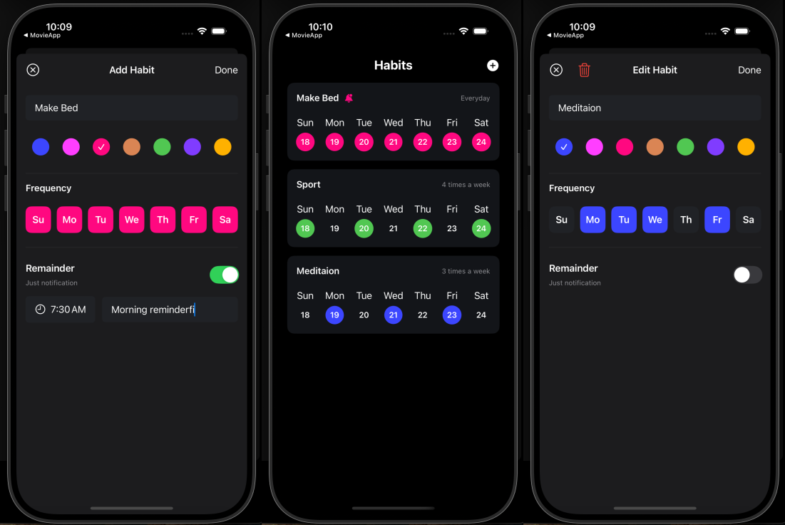 A habit-tracking app with notifications to help users build and maintain good habits. Users can add, edit, and track their daily habits. View Source Code